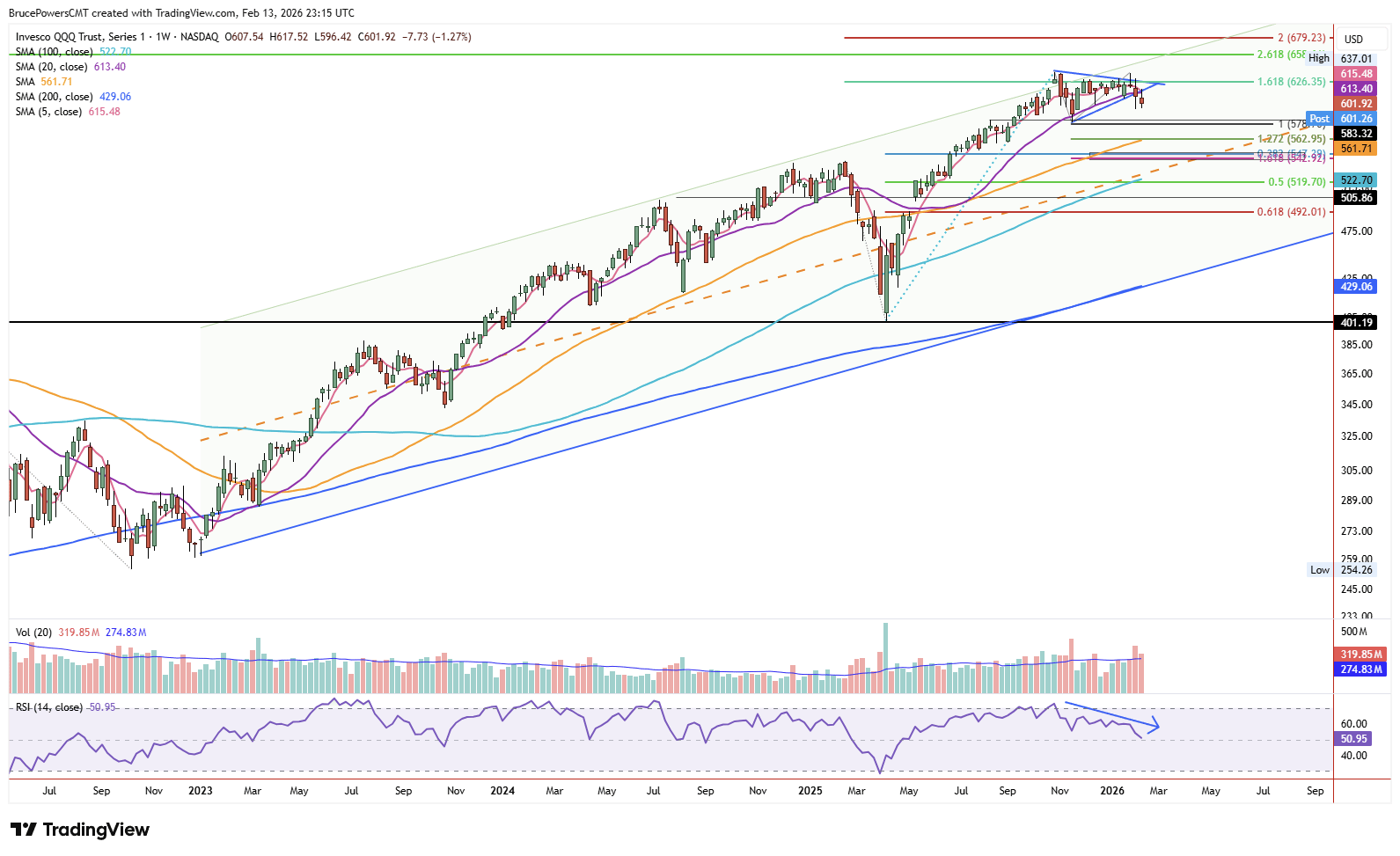 The Invesco QQQ Trust (QQQ), which tracks the Nasdaq-100 Index, is showing increasing signs of deterioration in its long-standing bull trend following a decisive breakdown from a symmetrical triangle top and the 20-week moving average. That breakdown occurred at the top of an ascending trend channel, marking a meaningful shift in the technical structure. Last week marked the first weekly close below the 20-week moving average, now at $613.40, since May 2025. QQQ confirmed the breakdown this week, with another close below the key 20-week average and below the triangle formation at $601.92. That was the lowest weekly closing price in 11 weeks. The timing of the breakdown is notable, as the 20-week average had aligned closely with the lower trendline of the potential top consolidation pattern. That alignment created a strong confluence of support, and its failure strengthens the case that this may be more than routine volatility.